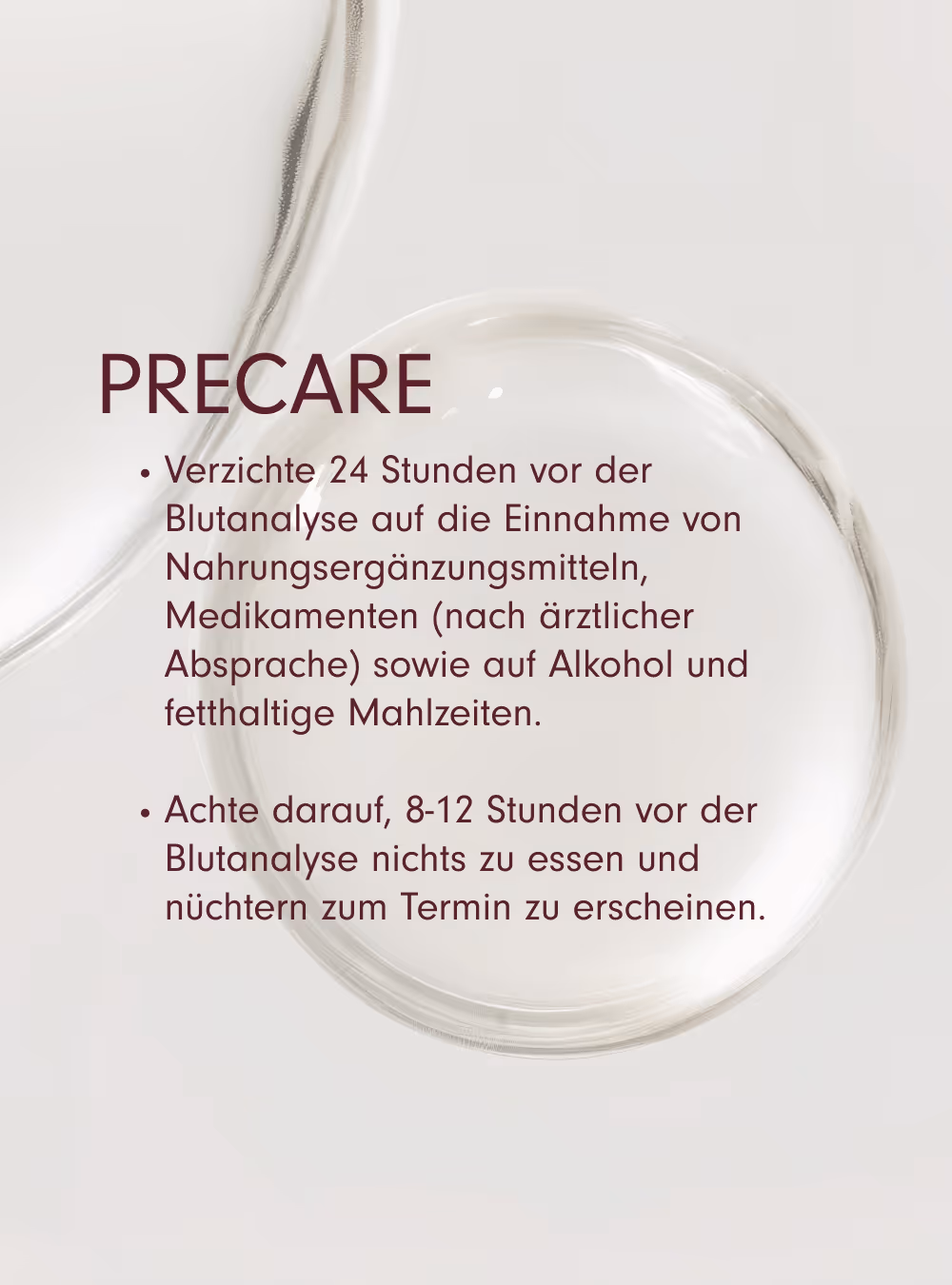 Ja, Du solltest 8-12 Stunden vor dem Bluttest auf Essen verzichten. Beachte bitte auch, dass Alkohol und fettige Mahlzeiten 24 Stunden vor dem Termin vermieden werden sollten.