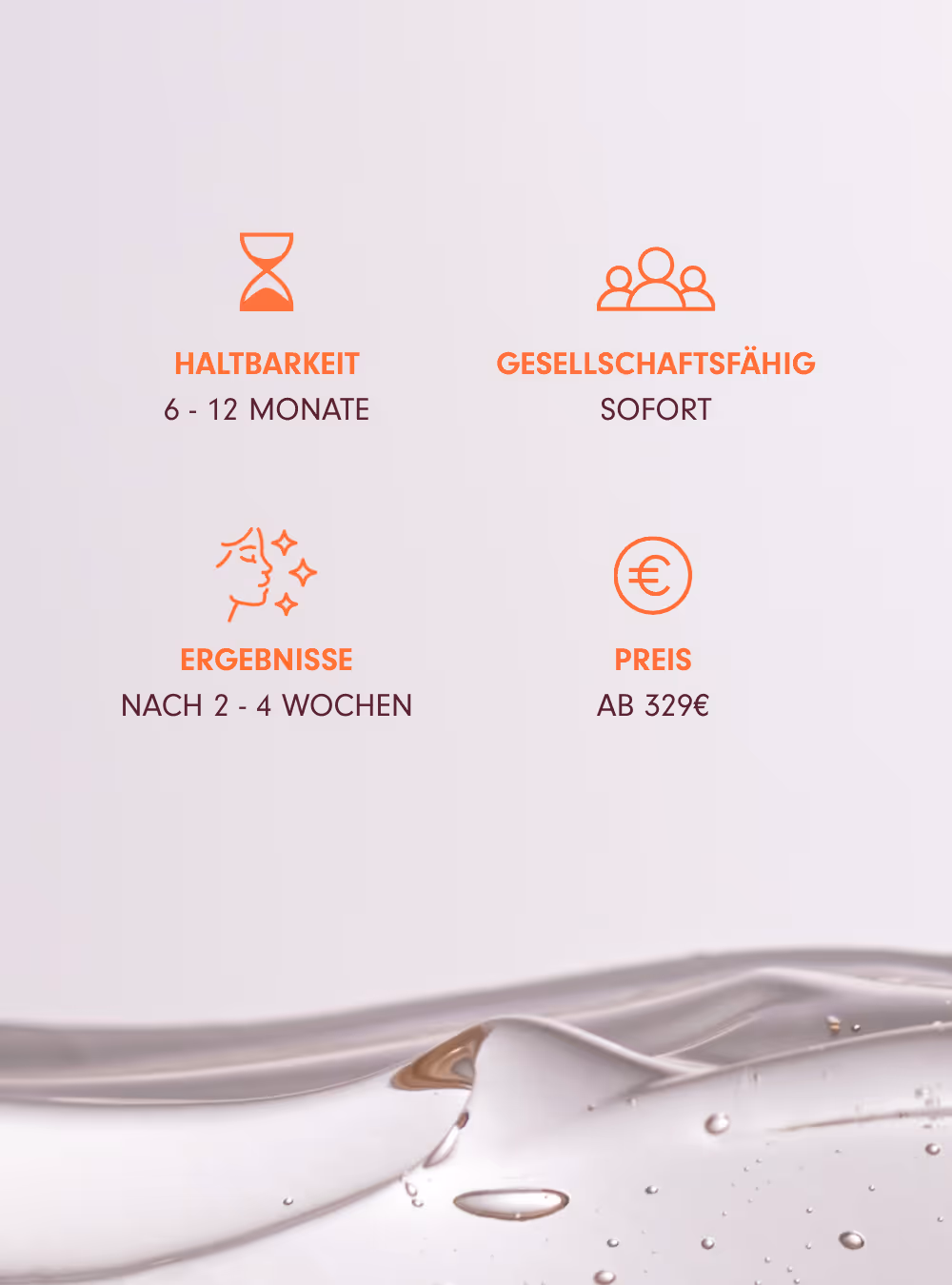 Die Behandlung ist ideal bei leichten Fältchen und nachlassender Elastizität, glanzloser Haut oder unruhigem Hautbild und ersten altersbedingten Strukturveränderungen.