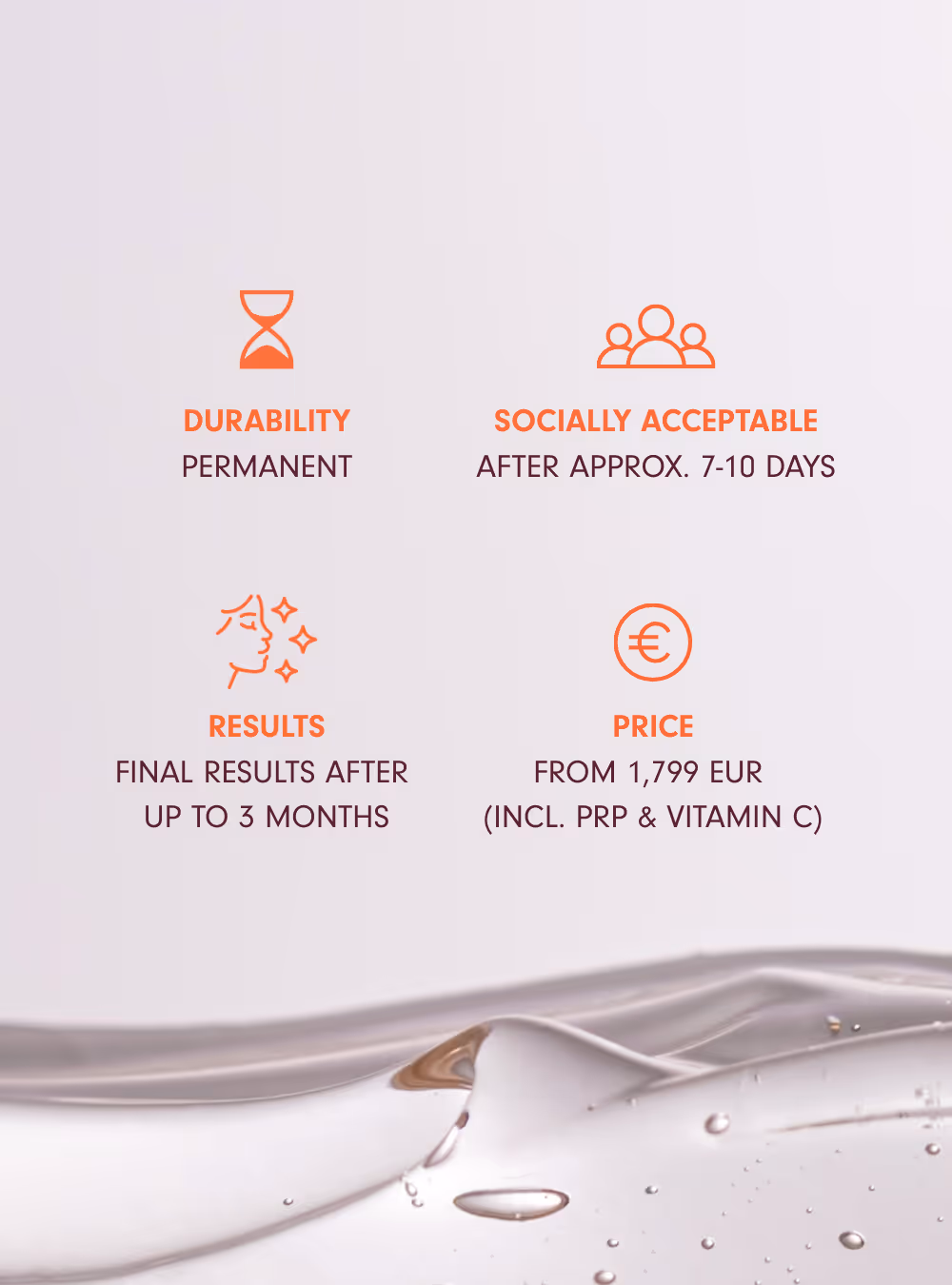 The CO2 Laser treatment is combined with PRP therapy and with the antioxidant vitamin C. Both support the healing process and collagen production. This promotes skin regeneration and visibly improves the treatment results.