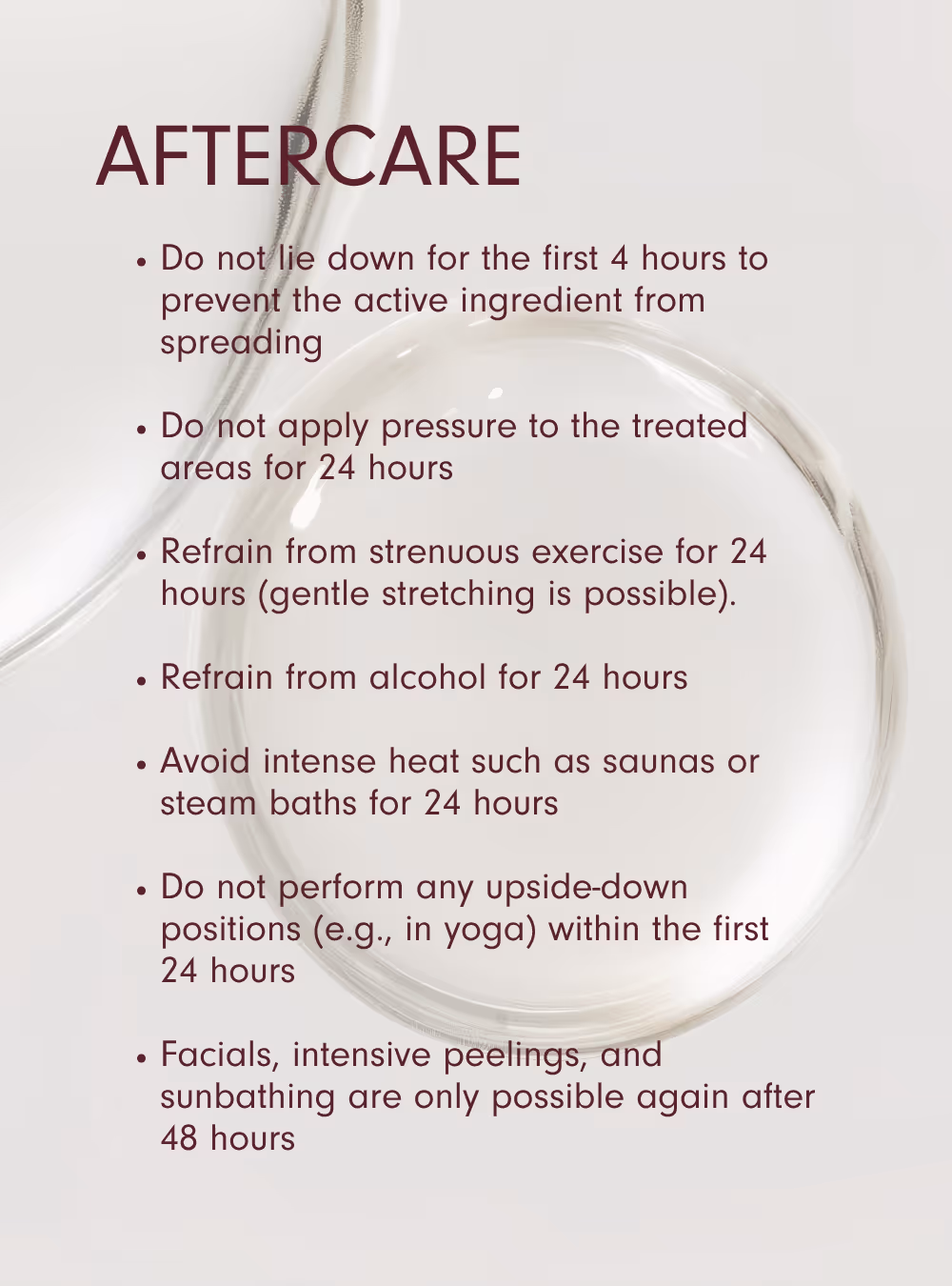 - Do not wear make-up for the treatment (can also be removed on site if necessary).